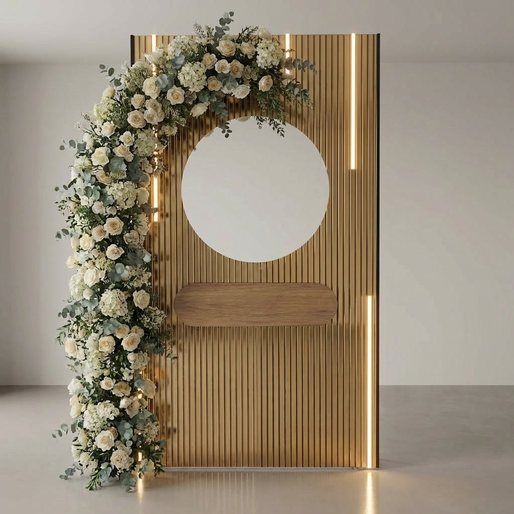 This premium installation combines a fluted luxury centre panel with two high-resolution LED poster screen panels, creating a full-width display capable of showcasing personalised imagery or looping video throughout your event. Integrated lighting, refined finishes and intentional proportions deliver a bold yet balanced statement that feels modern, polished and unmistakably luxury.