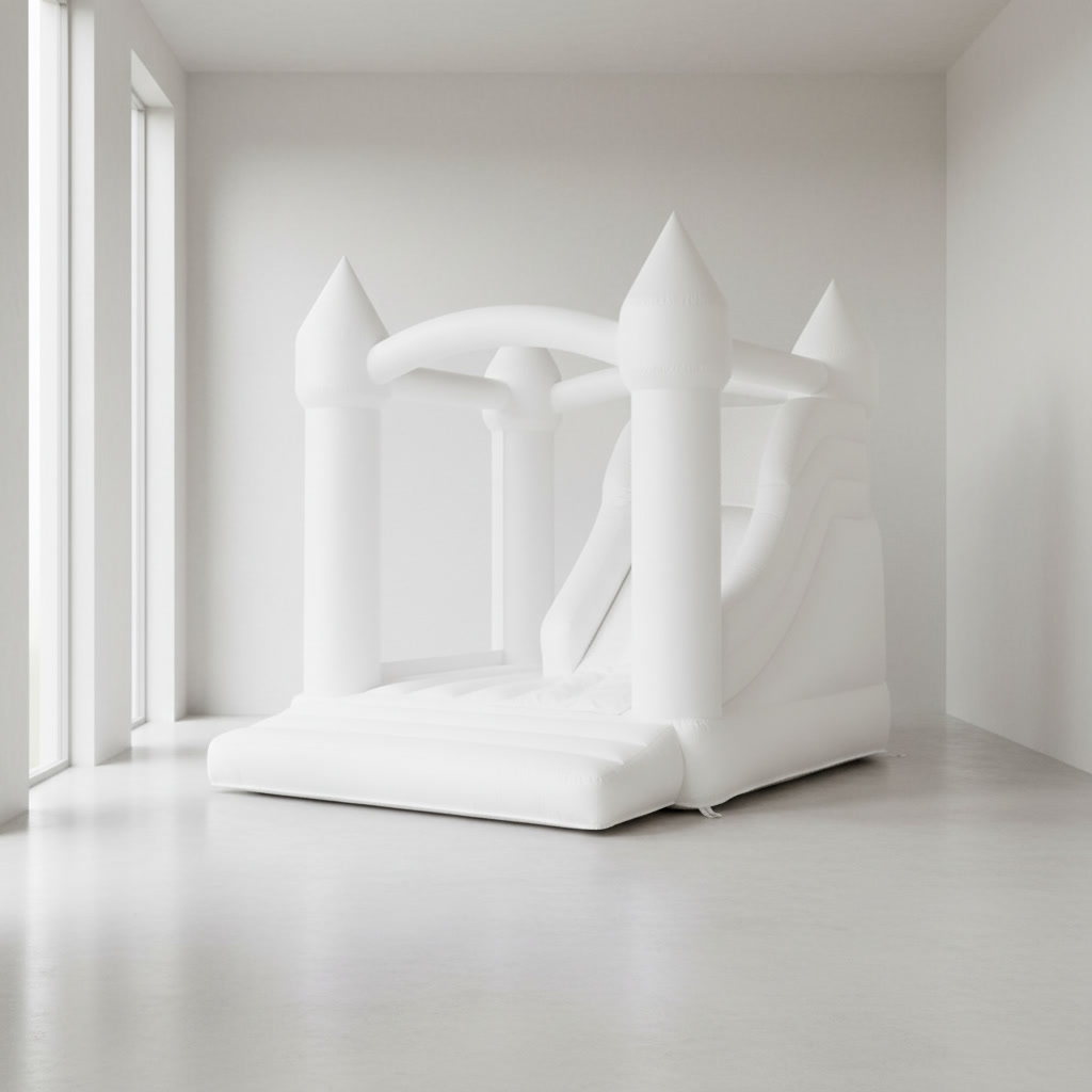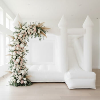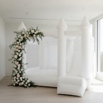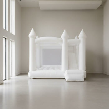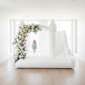A beautifully styled white bounce castle designed for elegant children’s parties, indoor celebrations and modern event spaces.